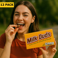 12 Pack Milk Duds Chocolate Bars (5Oz) are the deliciously chewy chocolate-covered caramel treats that never disappoint. Each box is filled with bite-sized pieces featuring rich milk chocolate coating over soft, creamy caramel centers. Whether you’re watching a movie or craving a classic sweet snack, Milk Duds deliver a tasty, chewy delight every time.